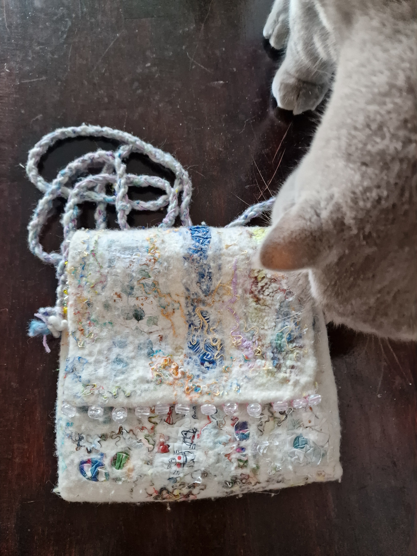 A experimentuju se vším co se mi dostane do ruky. Schovávám si zbytky nitek, bavlnek a vlny, vezmu kousky látek, na vřetánku si upředu tlustou nitku a mám taštičku, kterou ráda nosím.