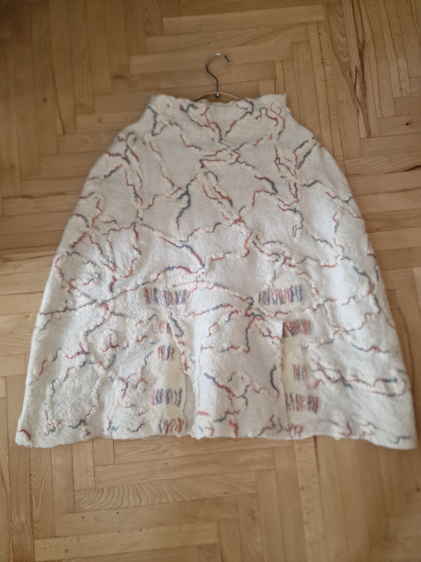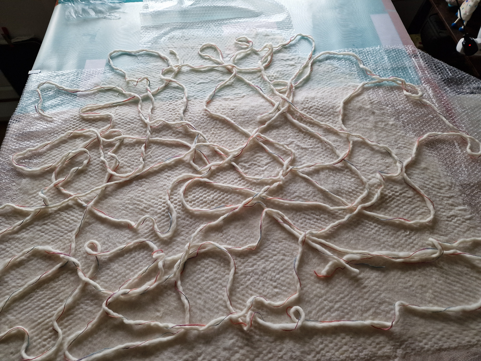 No, to si člověk udělá šablonu, spočítá si kolik potřebuje materiálu a pak začne plstit. Přidá trochu příze a připravený předfilc a pak se to všechno splstí dohromady a dílo je hotové.