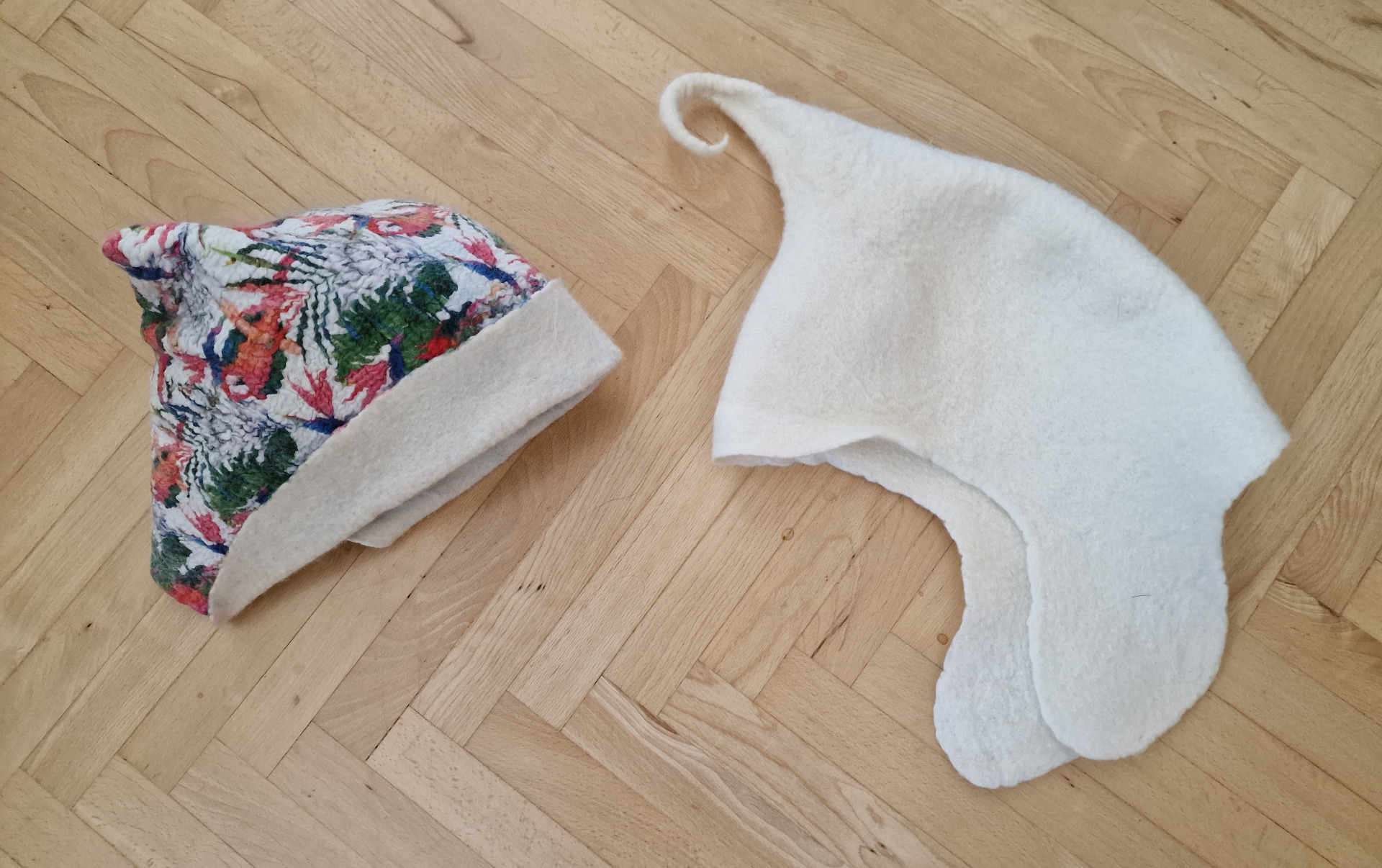 Zatím jen návrh na to, v čem chodit do sauny. V levo nano čepice s bavlněným mušelínem a v pravo čepice trpaslice. Kocour je živý :D