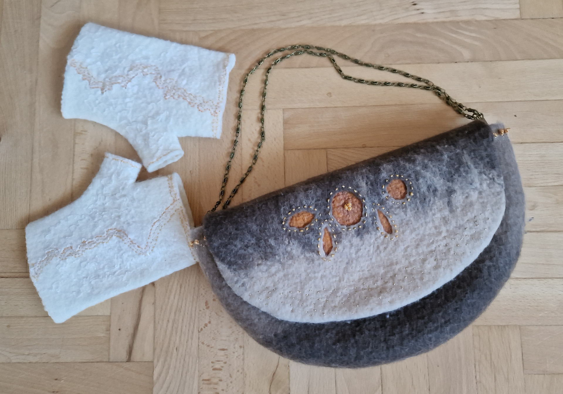 Je čas na kabelku a nátepníčky, protože začala divadelní sezóna. Tady kabelka s jemné béžové vlny 18 mik. a bílé vyšívané nátepníčky.